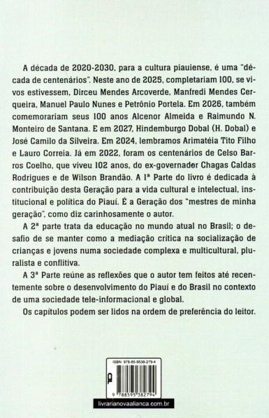 A década de 2020-2030, para a cultura piauiense, é uma "década de centenários". Neste ano de 2025, completariam 100, se vivos estivessem, Dirceu Mendes Arcoverde, Manfredi Mendes Cerqueira, Manuel Paulo Nunes e Petrônio Portela. Em 2026, também comemorariam seus 100 anos Alcenor Almeida e Raimundo N. Monteiro de Santana. E em 2027, Hindemburgo Dobal (H. Dobal) e José Camilo da Silveira. Em 2024, lembramos Arimatéia Tito Filho e Lauro Correia. Já em 2022, foram os centenários de Celso Barros Coelho, que viveu 102 anos, do ex-governador Chagas Caldas Rodrigues e de Wilson Brandão. A l' Parte do livro é dedicada à contribuição desta Geração para a vida cultural e intelectual, institucional e política do Piauí. É a Geração dos "mestres de minha geração", como diz carinhosamente o autor.
