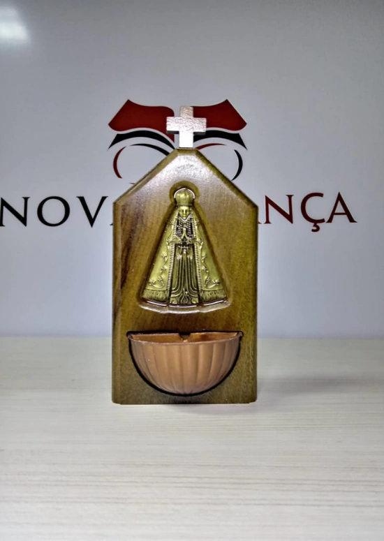 Pia de Água Benta de Nossa Senhora Aparecida em madeira e metal.
