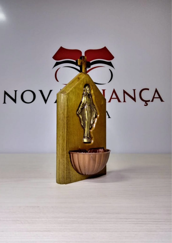 Pia de Água Benta em Madeira com imagem de Nossa Senhora das Graças em Metal Ouro Velho Resinado.