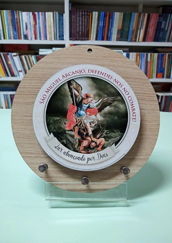Porta Chave redondo de São Miguel Arcanjo feito em MDF com três pinos de suporte para chaves.